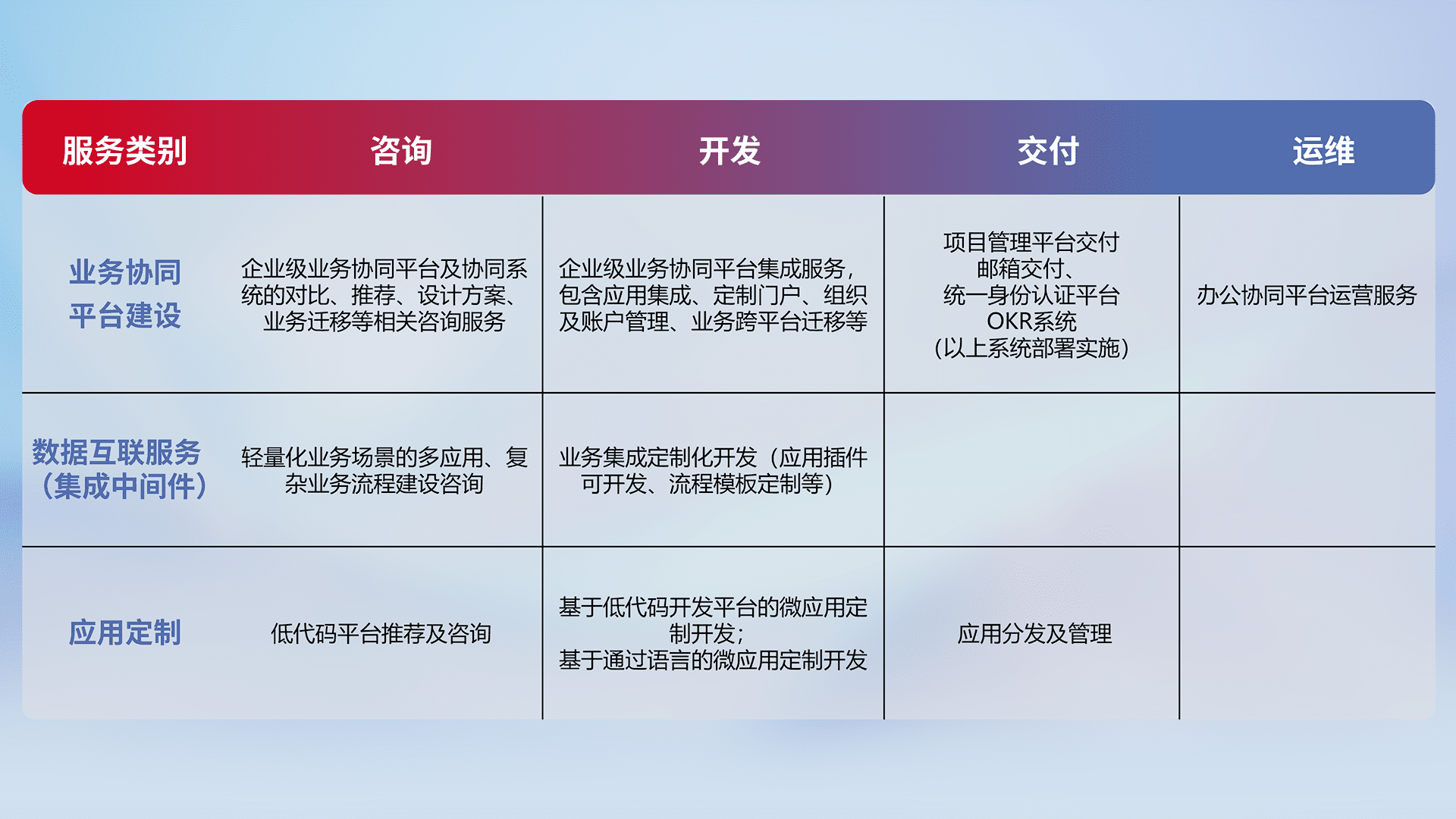 针对钉钉、、、、企微、、、IDaas等平台级产品提供产品的规划、、方案、、、、交付、、定制化开发等服务,,,,实现如统一协同办公、、、智能客户服务、、、混合会议管理、、智能数据查询、、、、等业务场景,,实现数字化转型。。。。