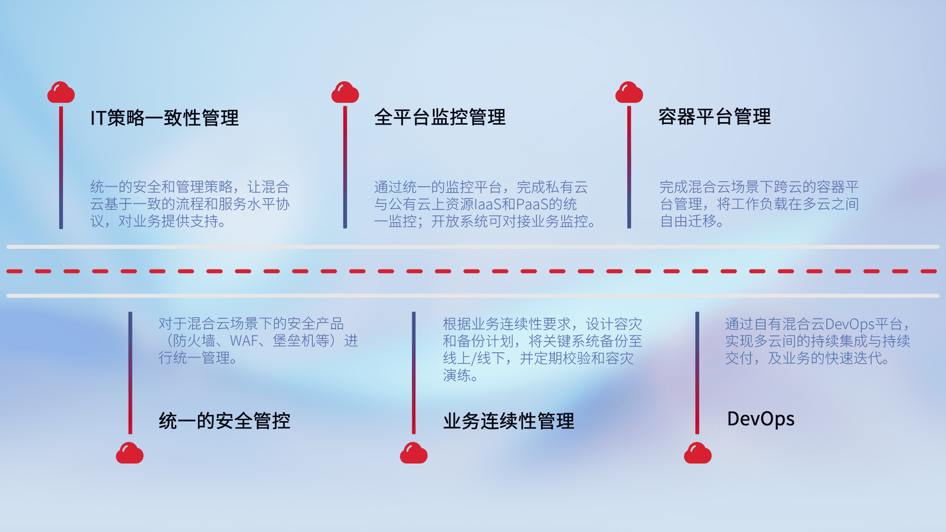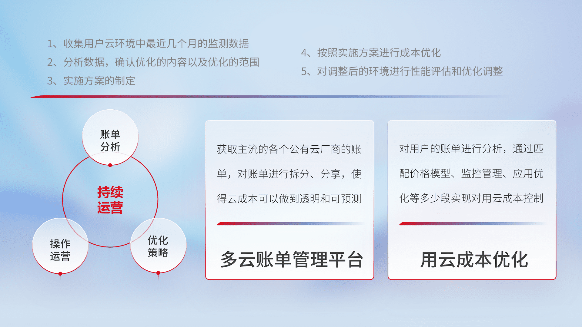 通过多云纳管,,以统一的资源数据模型把客户的云资源进行抽象和封装,,,,进而实现对多云资源的统一操作,,保障云资源管理的可靠性、、、稳定性与可用性。。。量身定制化运维内容,,,配置、、、开发运维、、、补丁管理、、、备份、、、、监控、、认证和访问管理、、审计和日常巡检等,,保障在用云过程中的可靠度,,,,稳定度以及高可用率。。